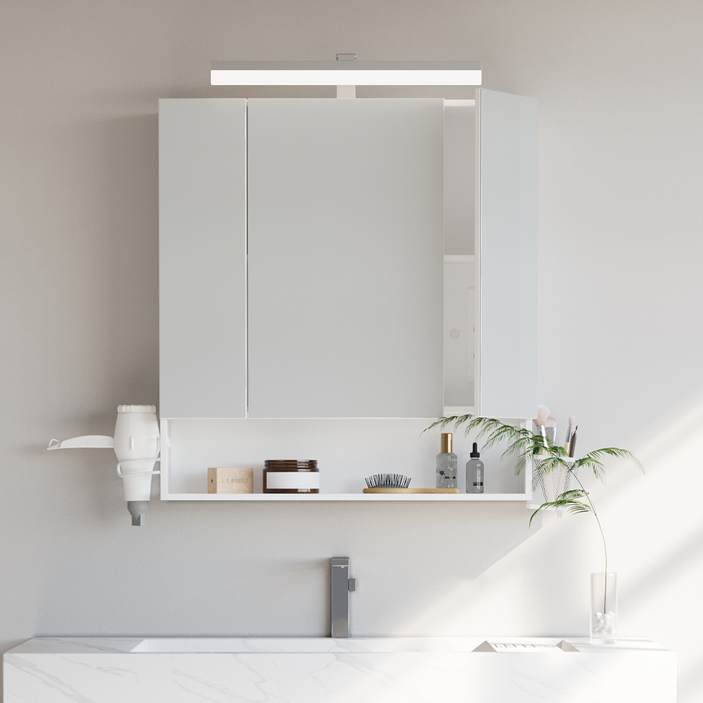 Mueble de baño de pared con espejo y 3 puertas, con luces, tomas de corriente, cesta y soporte para secador de pelo